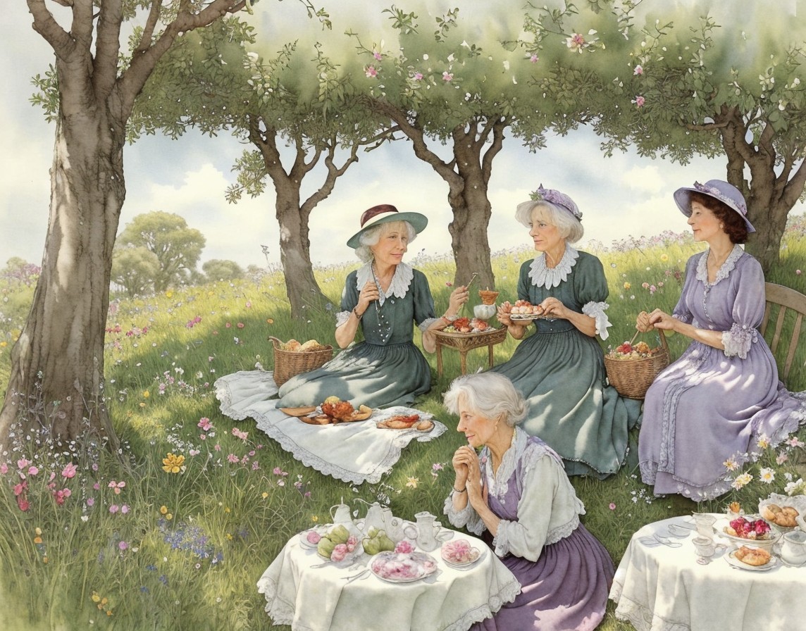 Two elderly women laugh together at a picnic under trees, surrounded by a basket, fruits, and flowers on a sunny day.