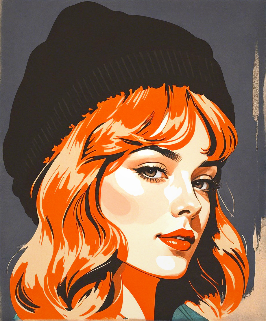 A stylish woman with vivid red hair and striking features wears a black beanie. The bold colors and clean lines create a graphic, modern aesthetic, highlighting her confident expression.