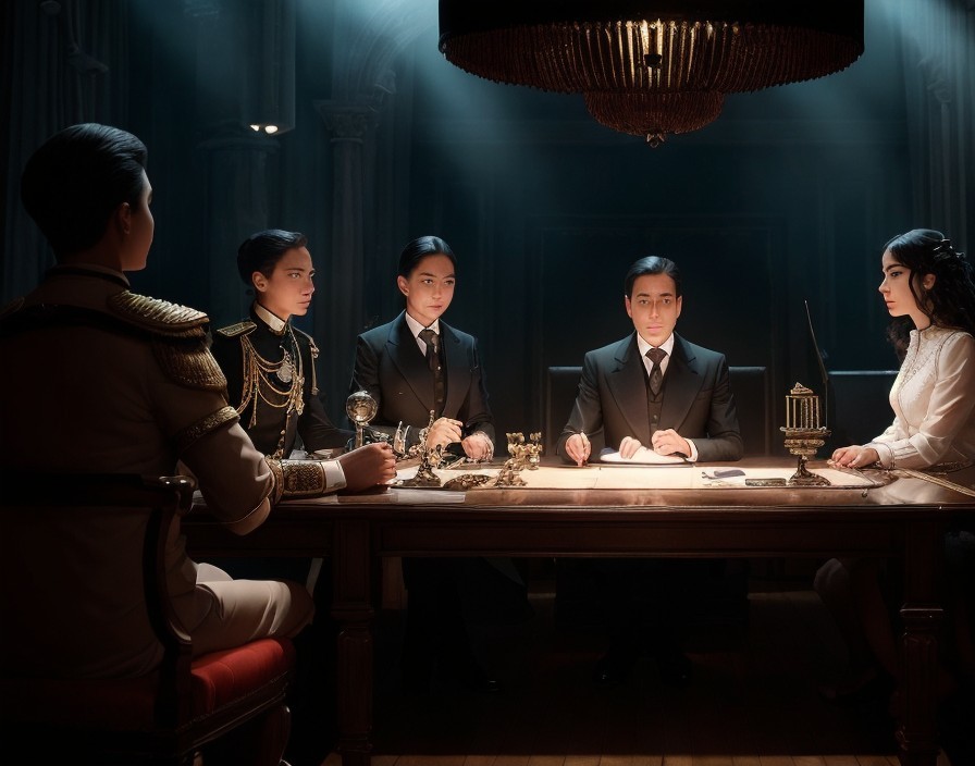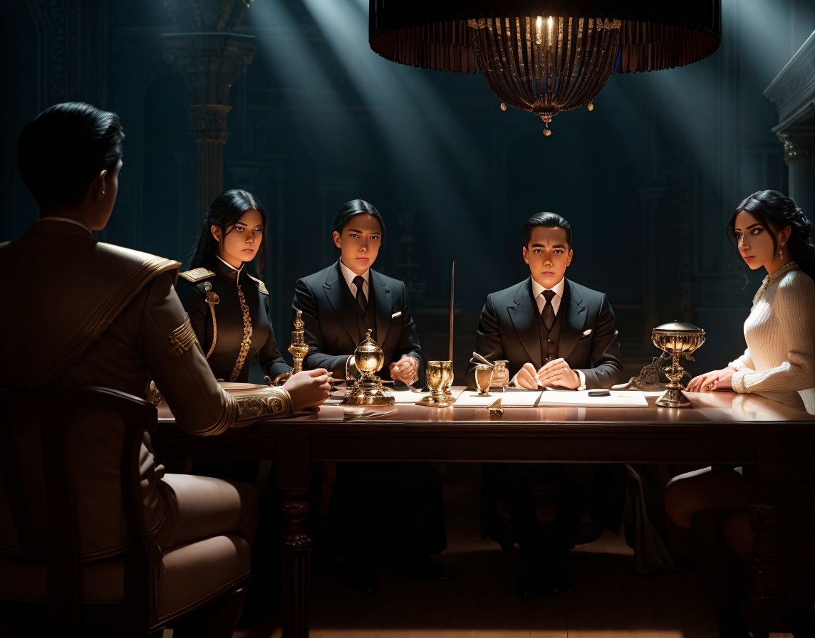 Four individuals are seated at a table in a dimly lit, opulent room, appearing solemn and focused, illuminated by candlelight.