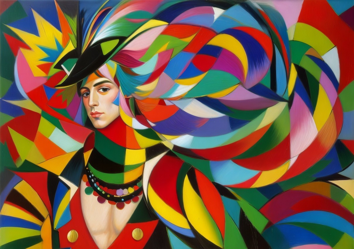 Prompt: man in drag with a fantastic hat, half-length portrait, oil on canvas, free loose brushstrokes, imprecise and impressionistic, Picasso meets Renoir