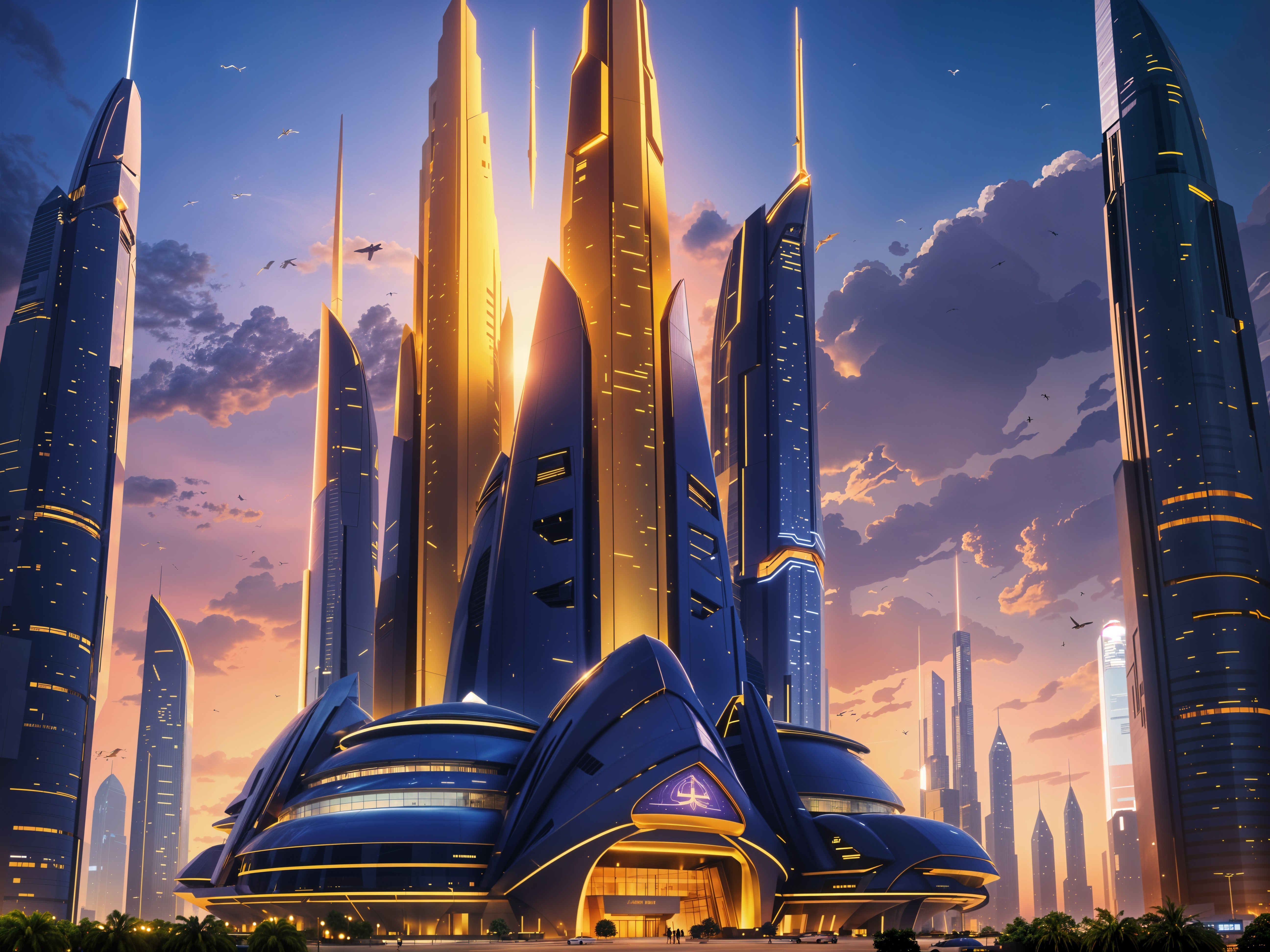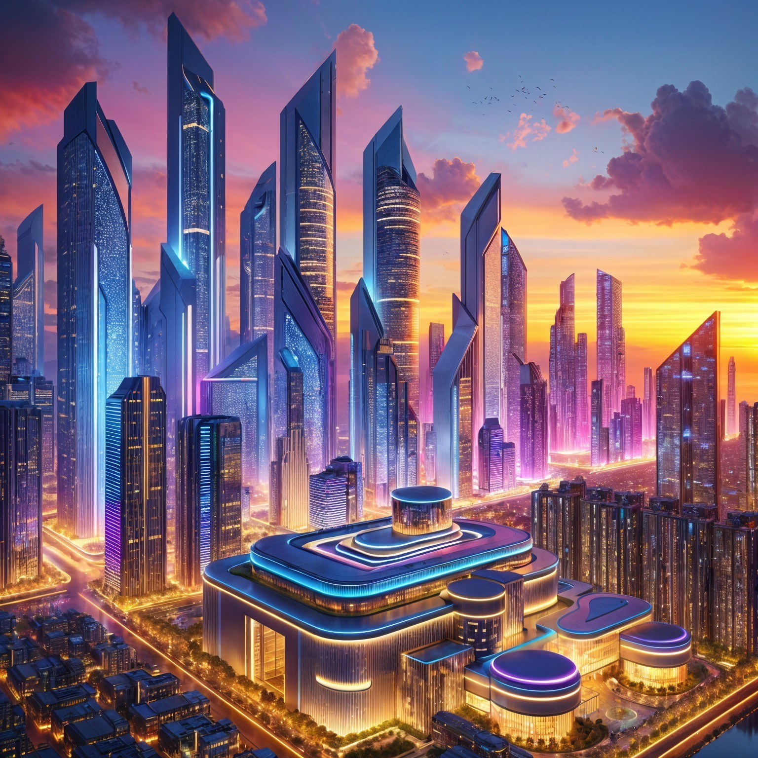 A futuristic cityscape features towering, sleek skyscrapers with neon lights and organic shapes, surrounded by greenery and illuminated by a stunning sunset, evoking a blend of nature and technology.