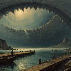 A surreal landscape depicting a massive, circular alien structure suspended high above a calm, reflective body of water. The structure resembles a giant, hollow spacecraft with intricate metallic designs and a glowing light emanating from its center, illuminating the scene. Below, a wooden dock extends into the water, where a solitary figure stands beside a small boat. Rugged cliffs rise in the background, creating a dramatic contrast to the futuristic architecture above. The overall atmosphere is mysterious and otherworldly, blending elements of nature and advanced technology.