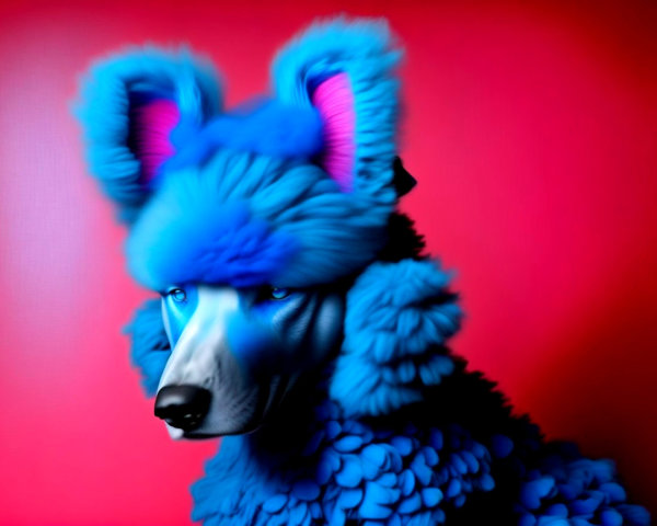 A whimsical dog dressed in a bright pastel suit and a colorful bowtie, sporting a floral mask with glowing accents. The vibrant background features colorful, swirling clouds.