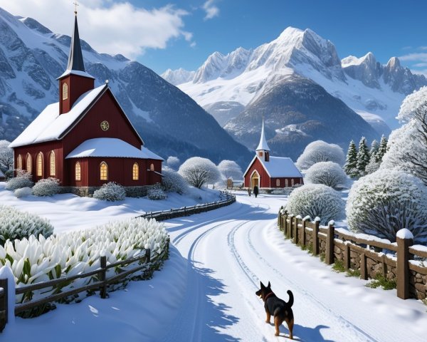 A serene village scene with charming houses and vibrant autumn trees. A dog stands on a cobblestone path, surrounded by colorful flowers, with majestic mountains in the background.