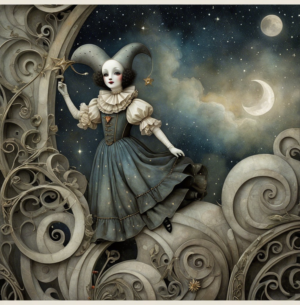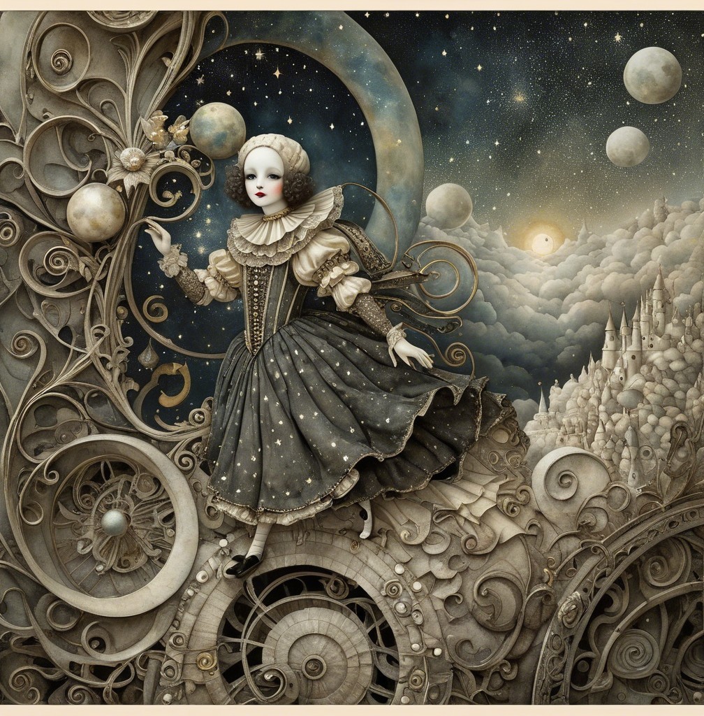 Close up, adorable Pierrot creature in the celestial maze, in the style of Alexander Jansson. by Catrin Welz-Stein, Michael Parkes