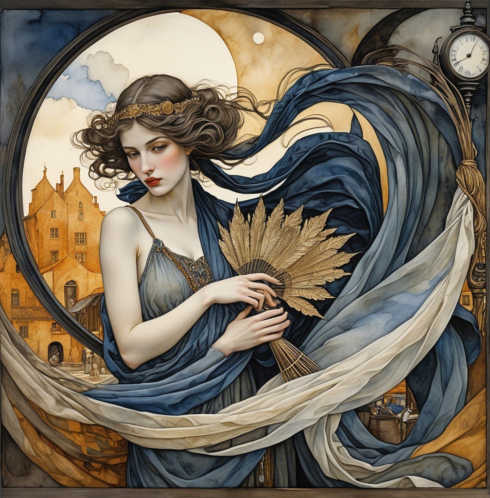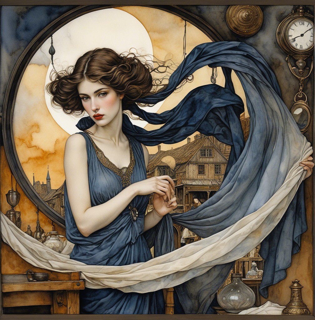 A young woman with wavy hair, dressed in a flowing dark blue gown, gracefully holds a sheer scarf. She stands amidst vintage clocks and artifacts, with a warm sunset in the background.