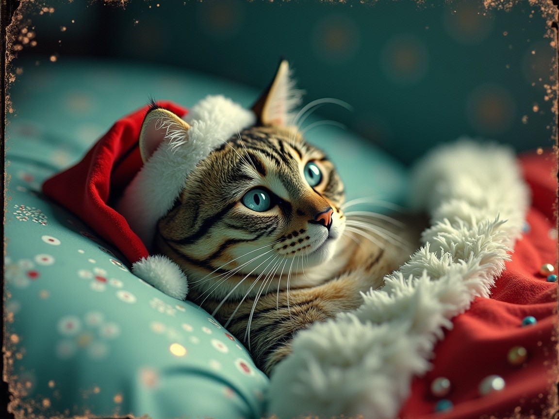 A cozy cat in a Santa hat rests on a pillow, wrapped in a festive blanket, with bright blue eyes and a curious expression, capturing the holiday spirit in a warm, delightful scene.