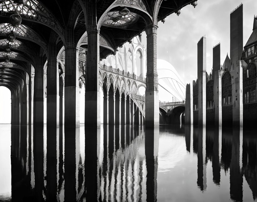 A black and white photograph of a grand bridge with Gothic elements, reflected on the calm surface of the water below it.
