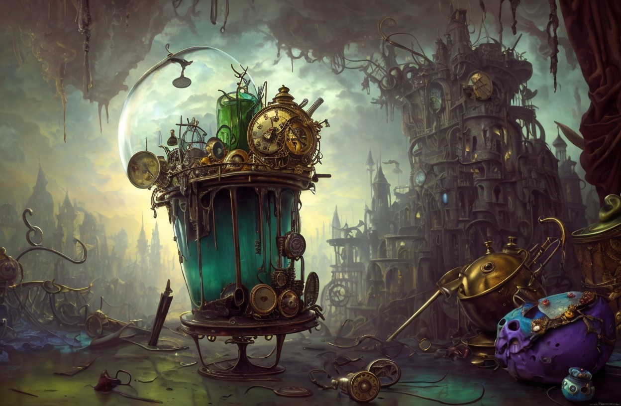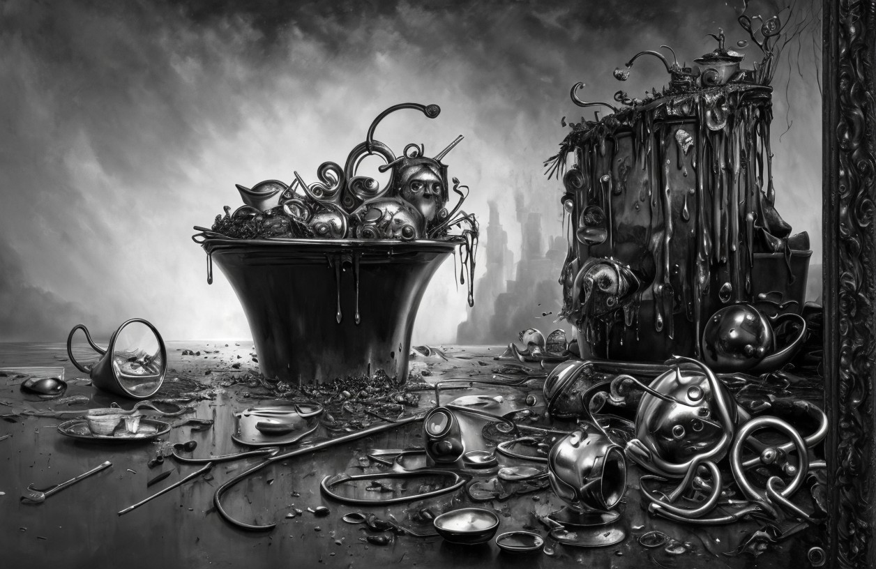 A monochrome artwork featuring various-sized skulls with a gothic aesthetic, some melting, amidst a gloomy backdrop.