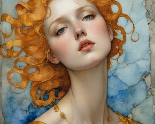 A surreal portrait of a girl with large eyes, surrounded by flowers and butterflies, with a whimsical, dreamy ambiance.