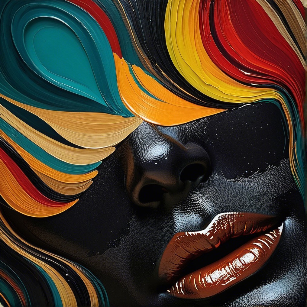 The image features a stylized face with vibrant, swirling hair in hues of yellow, orange, and teal. The glossy skin contrasts with bold red lips, creating a striking and artistic visual effect.