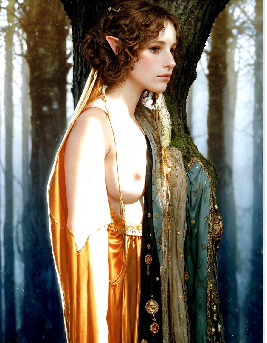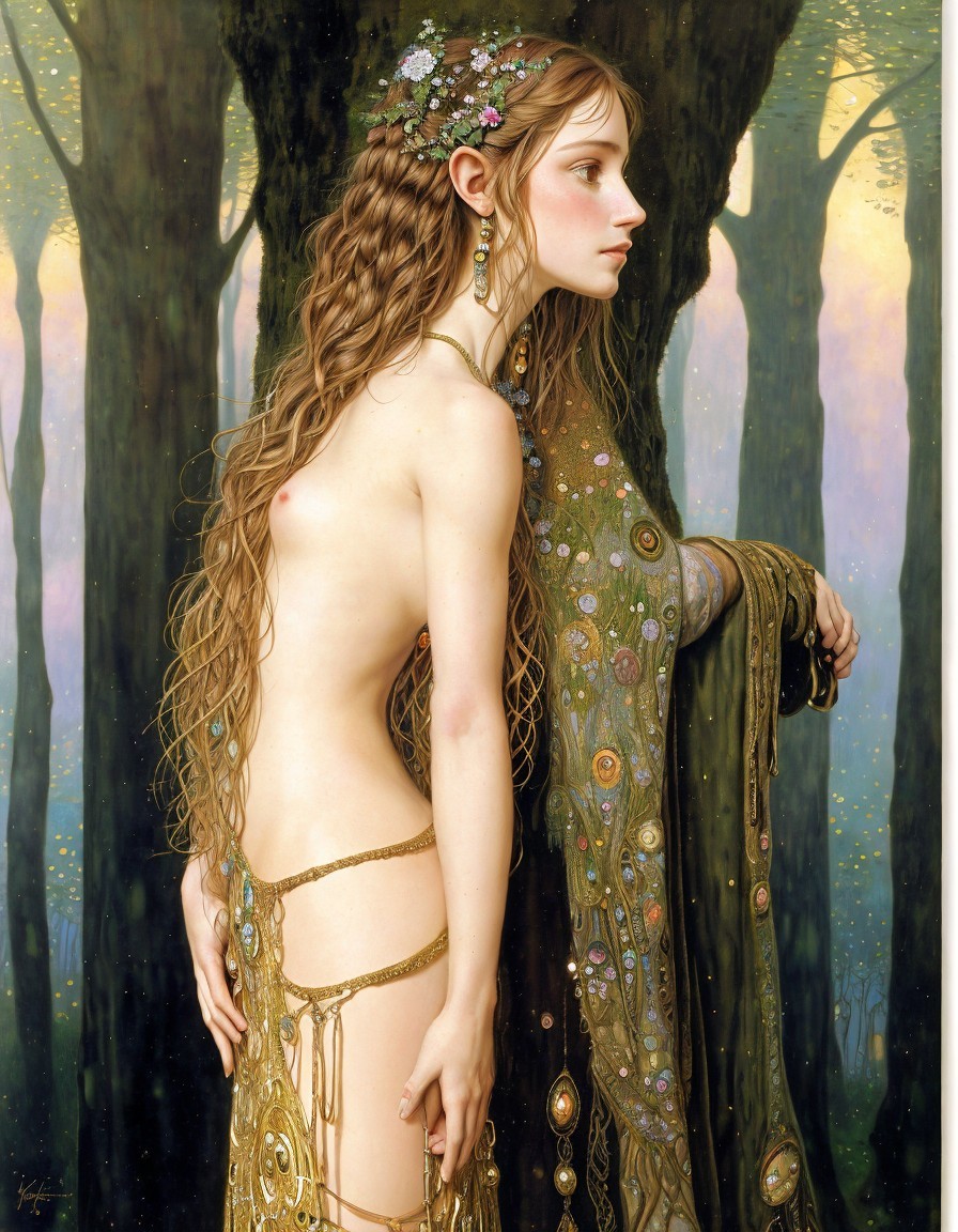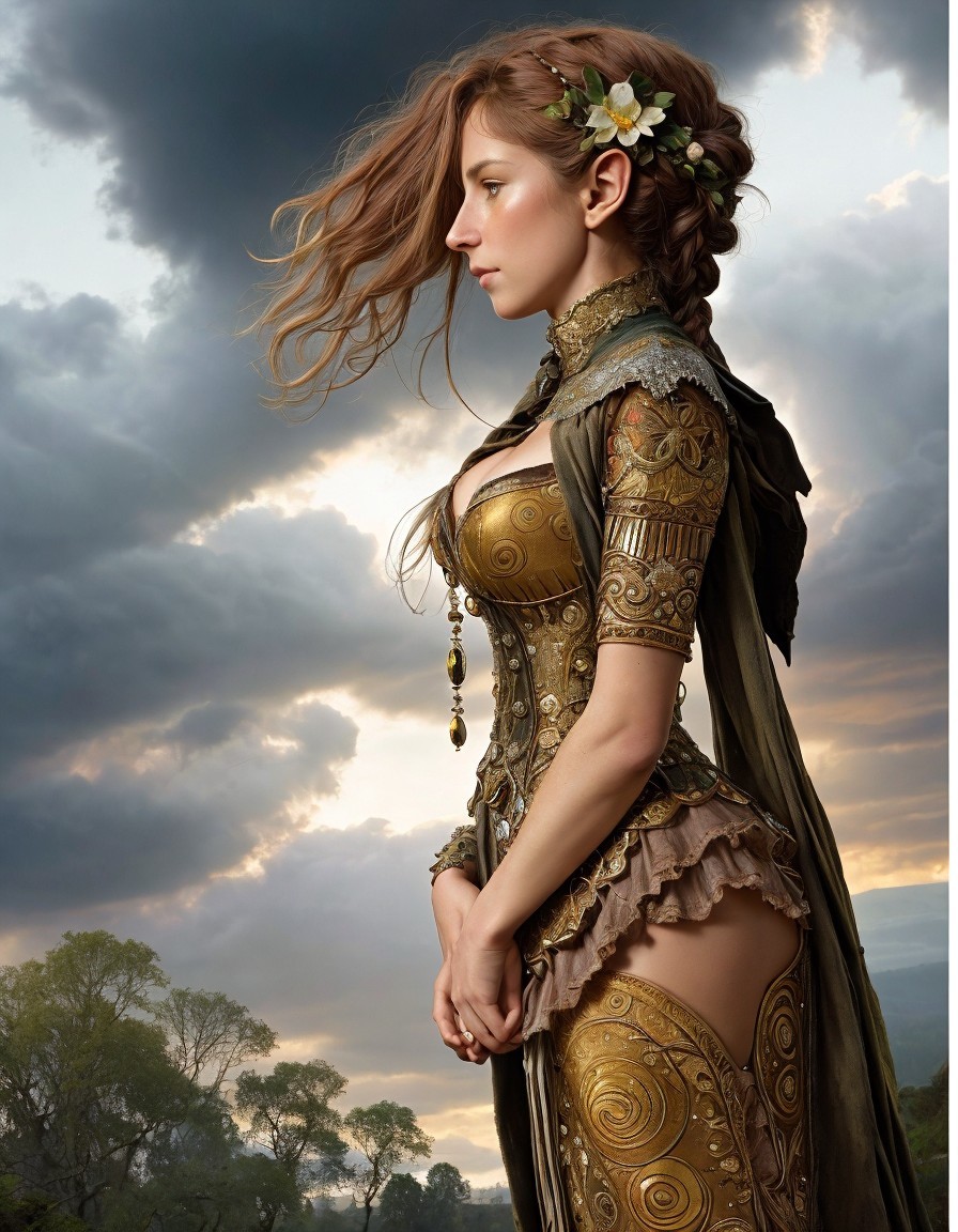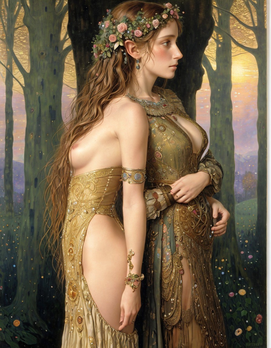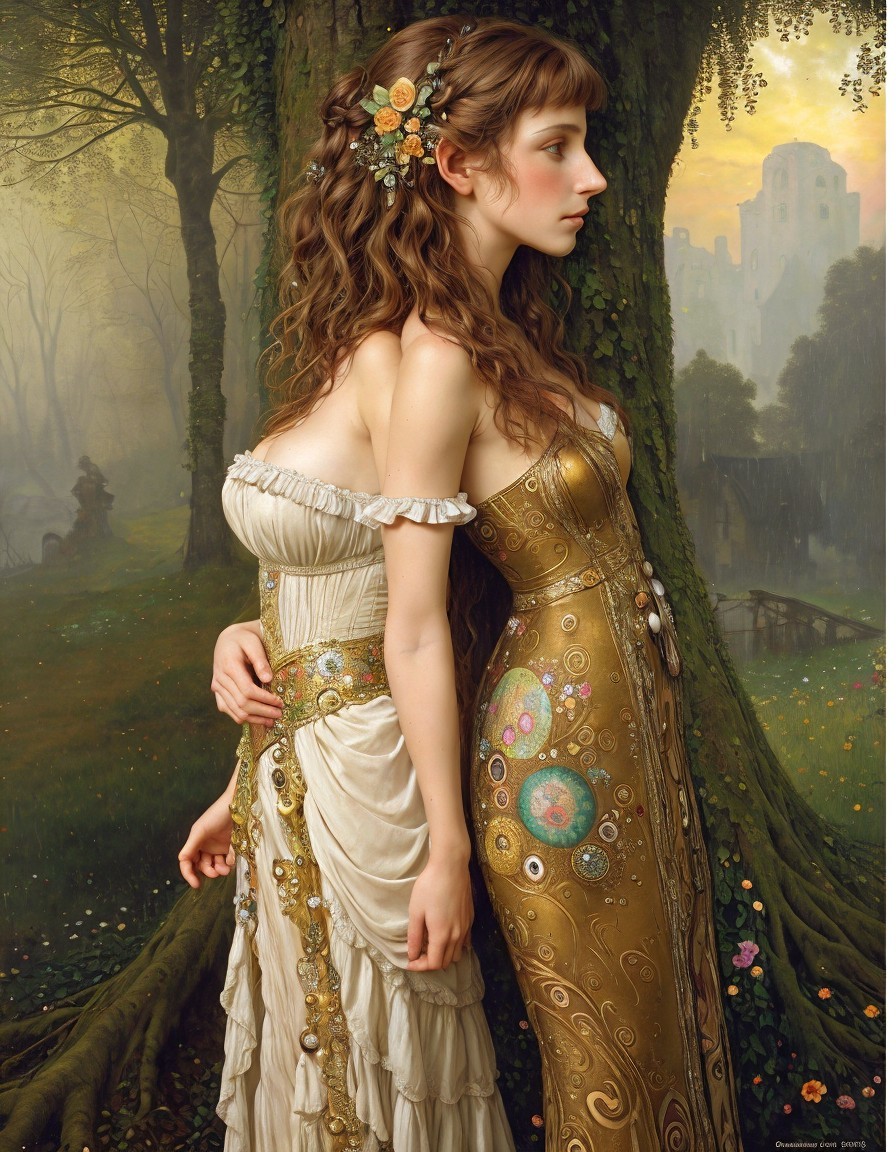 Prompt: "Jean-Baptiste Monge , Klimt and and Bosch style. ((Full body)) beautiful profile elf , ((dancing)) with a ((woman)) with a very detailed scars, roots . ((full body)). Ground-bound by ((roots)) in a ruined medieval village . Klimt style ((dress)) in nineteenth-century fashion. Sunset and stormy day. Raining , red moon, flowers, ((peacocks)), van Gogh style. Hyper-detailed, hyper-realistic, ornate, meticulously detailed, muted colors, muted colors, meticulous, intricate, highly detailed il. Cinematic light. Artwork. Masterpiece. Extremely detailed"