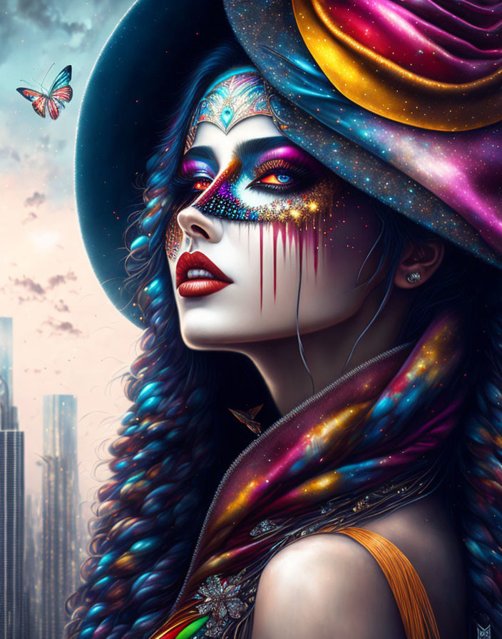 Prompt: "Cityscape as backdrop to an illustration by Mario Nevado depicting the face of a beautiful female harlequin suffering from desperate heartbreak"