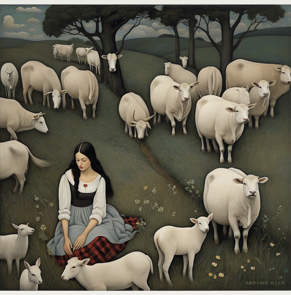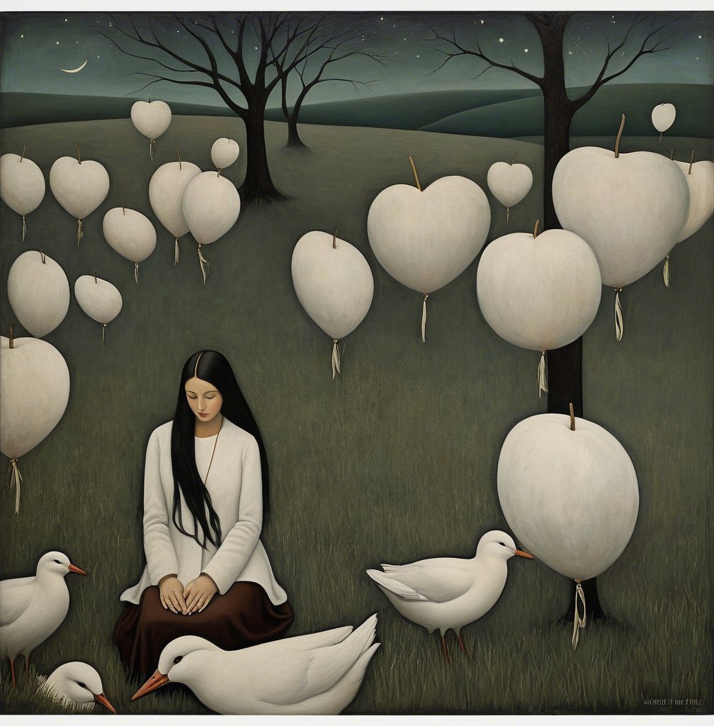 A serene landscape features a woman in white seated amid large, white spheres, surrounded by rolling hills, a tree, and a distant house under a crescent moon, evoking tranquility and introspection.