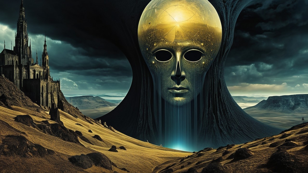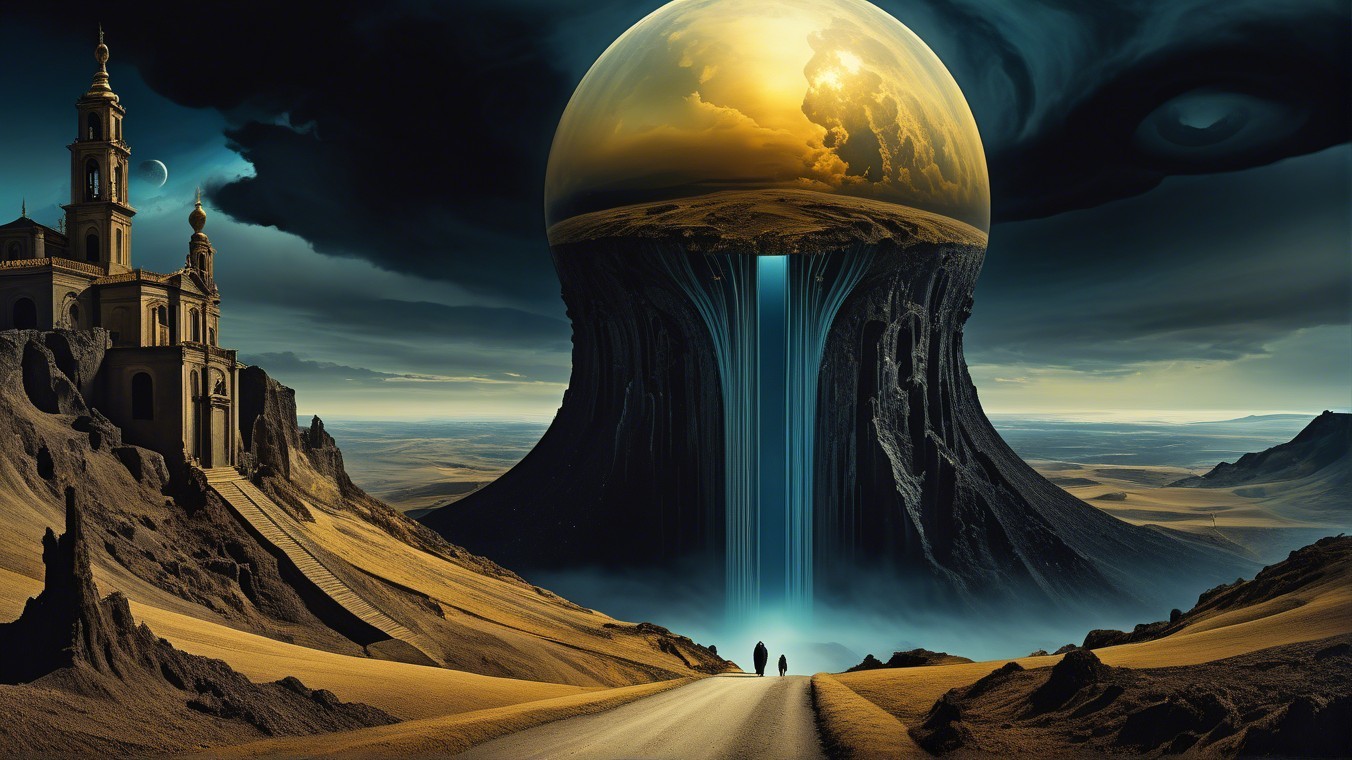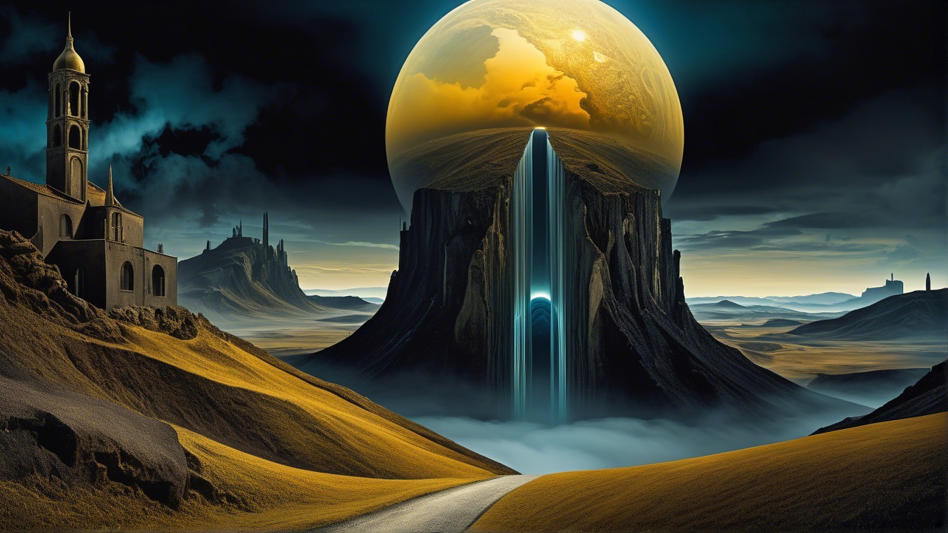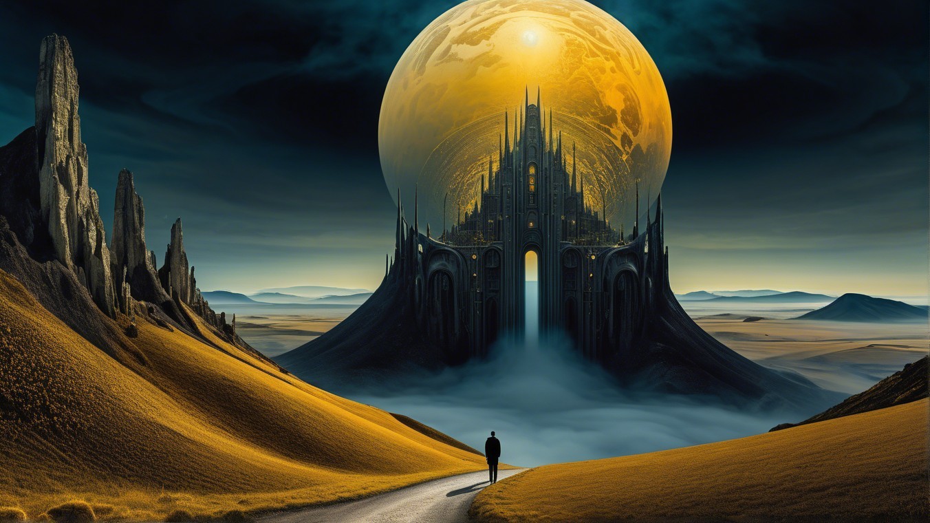 A mysterious landscape features towering mountains with archways, set against a dramatic golden moon. A figure stands on a winding path amidst rolling hills and dense clouds, evoking a sense of wonder.
