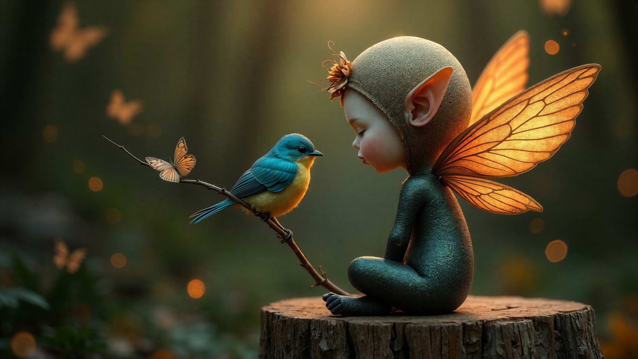 A highly detailed and surreal artwork depicts a delicate fairy or sprite-like figure with closed eyes and a serene expression, sitting on a weathered tree stump. The figure has a pale, human-like face with soft, rosy cheeks and light freckles, and prominent eyelashes. Its head is adorned with a sparkling, textured cap that tapers into a sheer, almost clear material around the ears. Attached to the left side of the cap are large, elaborate feathery wings in shades of orange and brown with fine speckled patterns, resembling autumn foliage or exotic bird feathers.