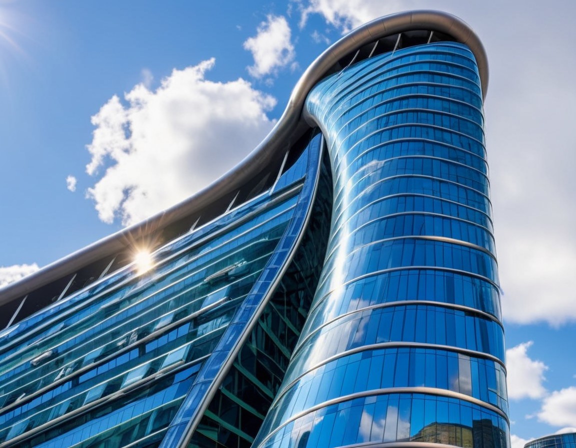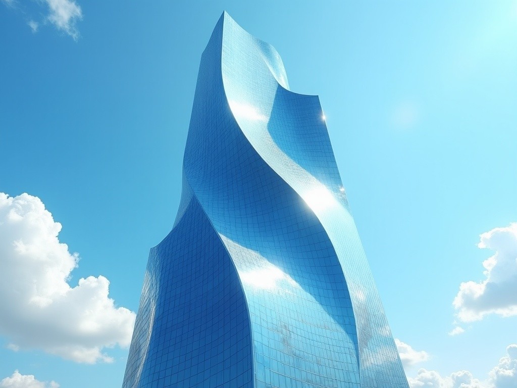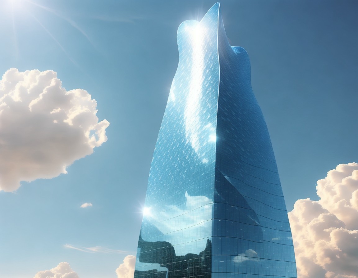 A sleek, modern skyscraper towers against a bright sky, its glass facade reflecting fluffy white clouds, creating a striking contrast with the minimalist design.