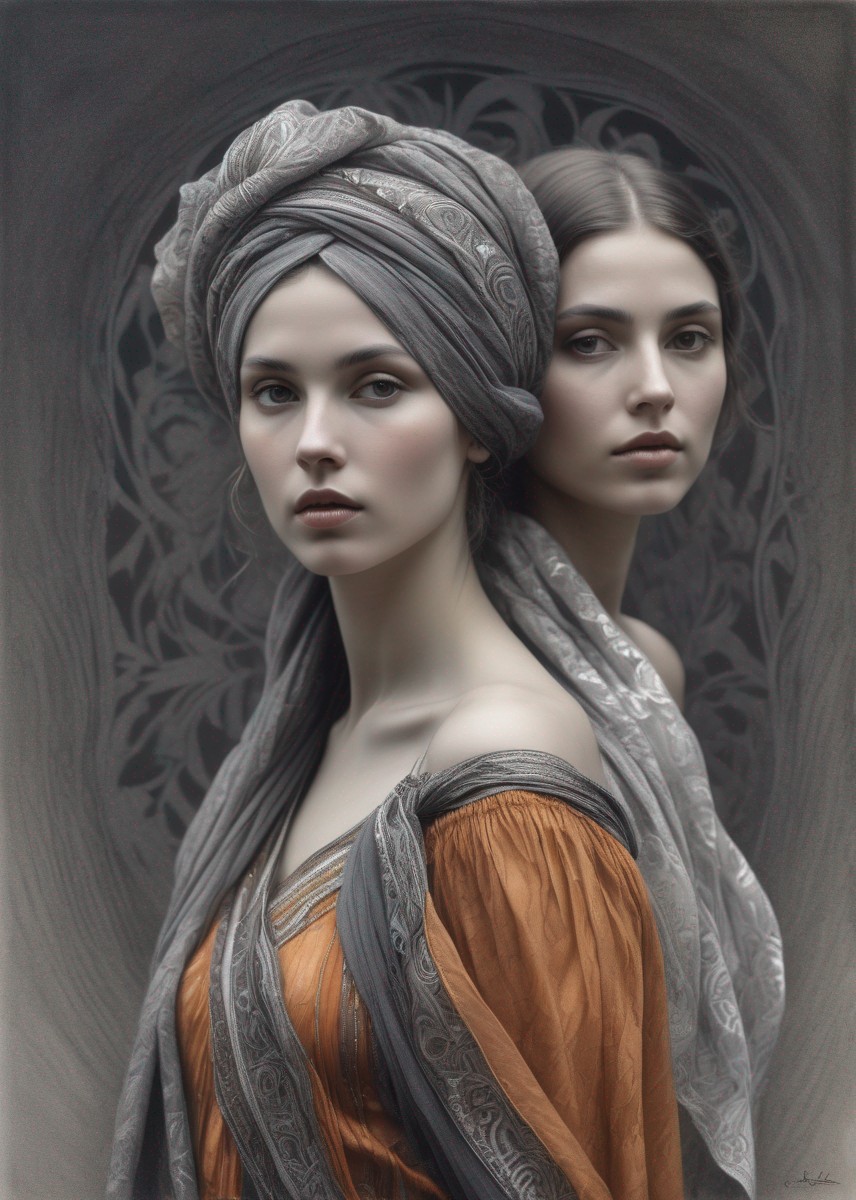 Two women with intricate headwraps and traditional jewelry, displaying a captivating and solemn elegance.
