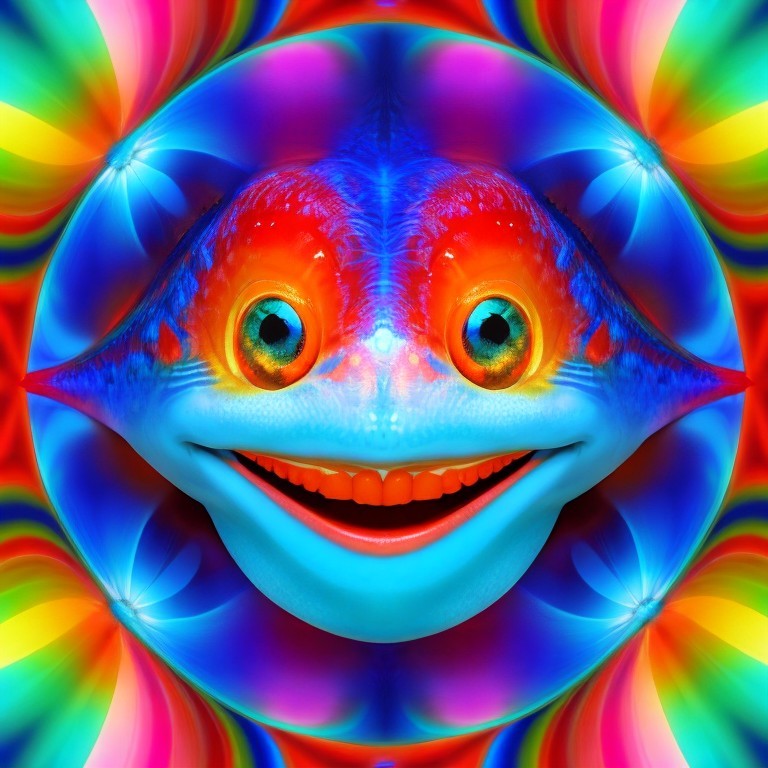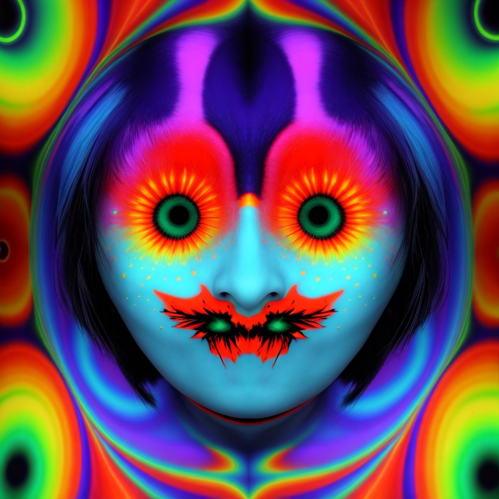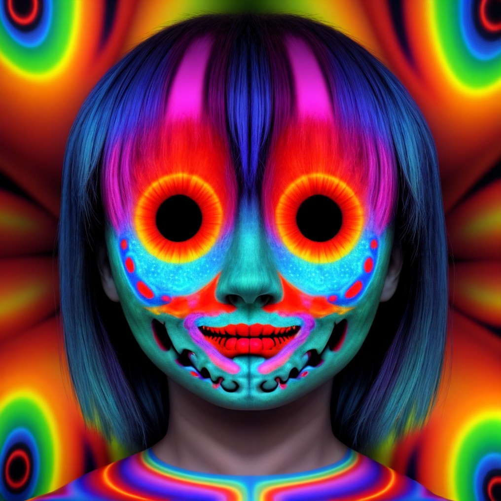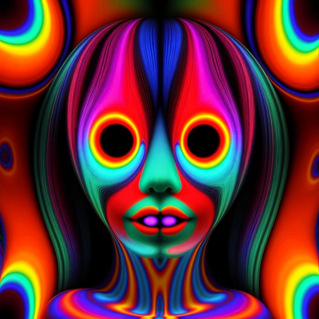 Vividly colored, psychedelic alien face with large eyes on a swirly multicolor background.