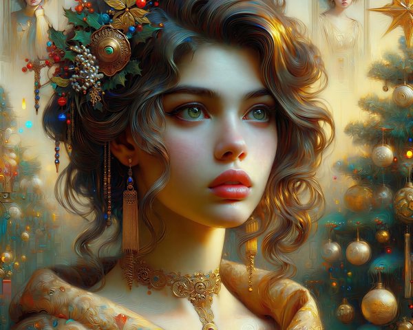 A young woman in a vintage blue gown with lace accents and a floral headpiece gazes thoughtfully. The backdrop features a serene landscape with mountains and a distant horseman.