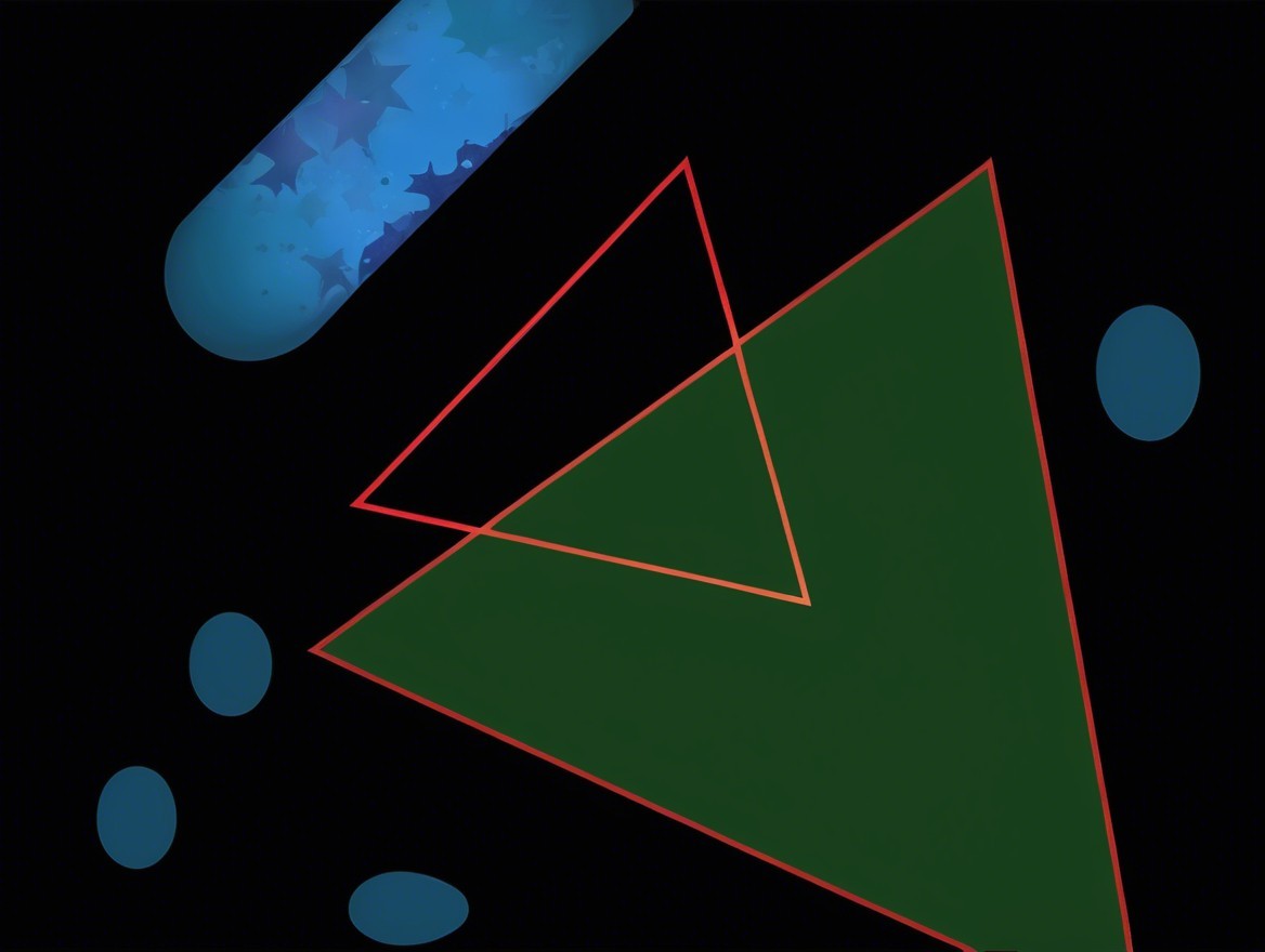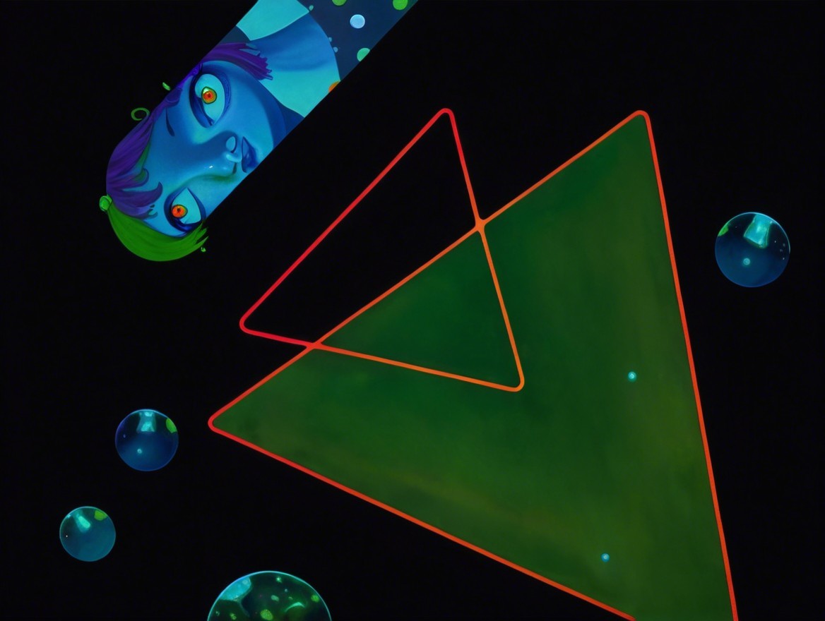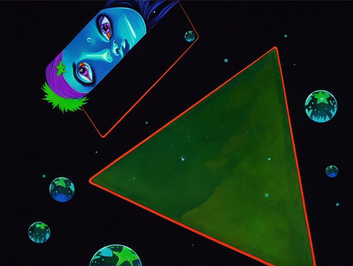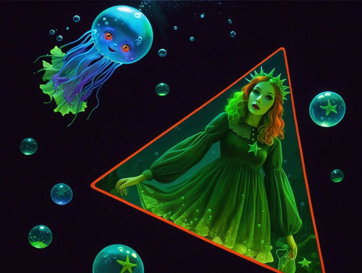 A surreal scene with a woman in a green dress inside a triangle, surrounded by jellyfish and bubbles on a dark background.