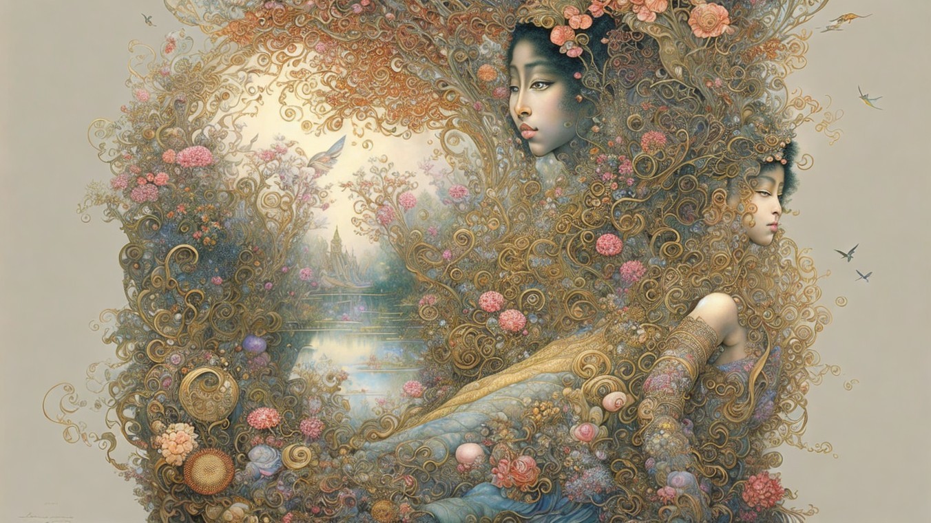 The image features a graceful figure adorned in elegant attire, holding a parasol. Intricate floral patterns and soft colors create an ethereal, serene atmosphere.