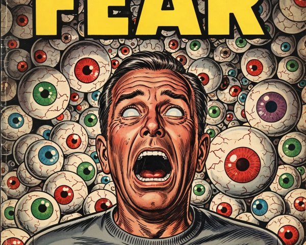The image depicts a man's face with a zipper revealing a chaotic, surreal world inside, featuring eerie figures and a vibrant landscape, symbolizing inner turmoil and hidden fears.