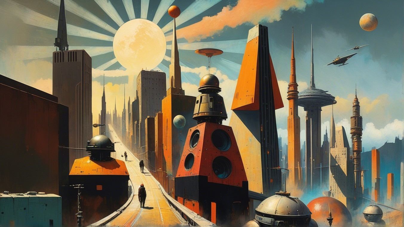 A stylized cityscape featuring geometric buildings with bold colors, sharp angles, and whimsical towers under a surreal sky, evoking a sense of futuristic exploration and artistic imagination.
