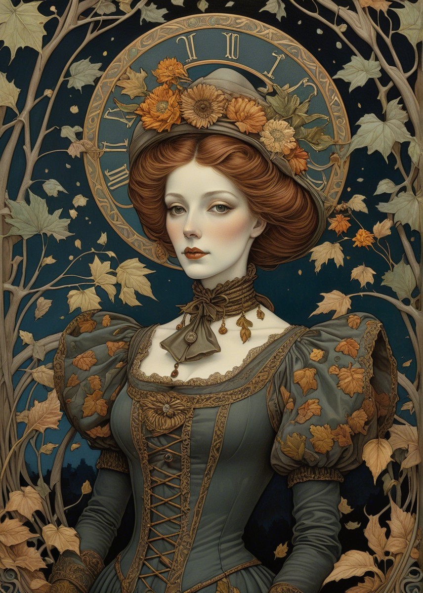 A beautifully illustrated woman in vintage attire stands amidst autumn leaves. Her elegant dress features intricate details, and she wears a wide-brimmed hat adorned with flowers, exuding grace and charm.