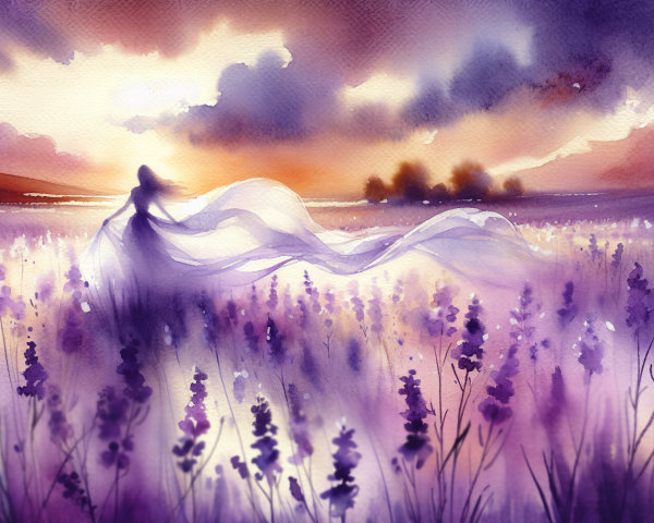 A dreamy landscape features a profile of a woman with flowing hair, surrounded by autumn leaves. In the background, a castle sits beneath a large golden moon, with birds soaring above.
