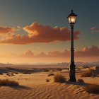 A solitary streetlamp stands in a vast desert landscape, casting a warm glow as the sun sets on the horizon. Soft clouds drift across the sky, enhancing the tranquil scene.