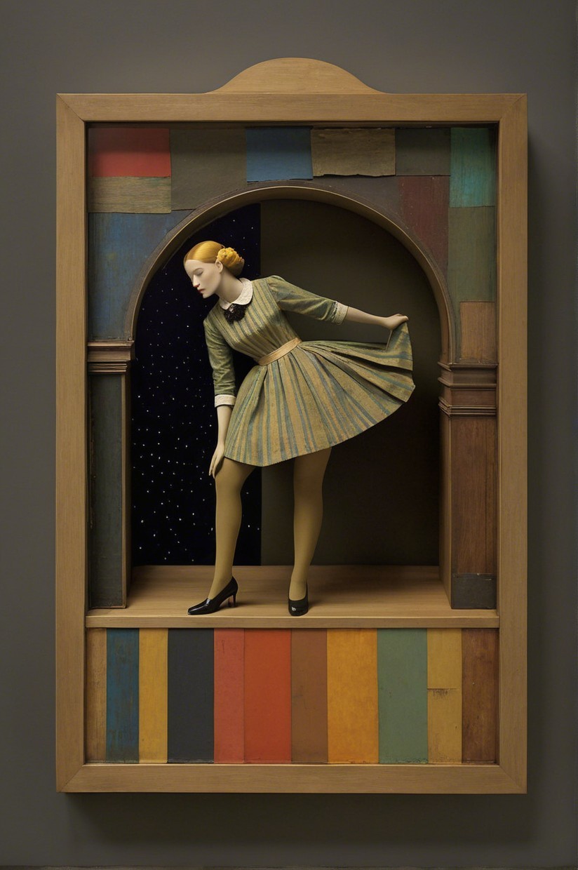 The image features three women in traditional attire, holding bags and positioned in a frame resembling a painting. The background has a colorful striped design, enhancing the artful presentation.