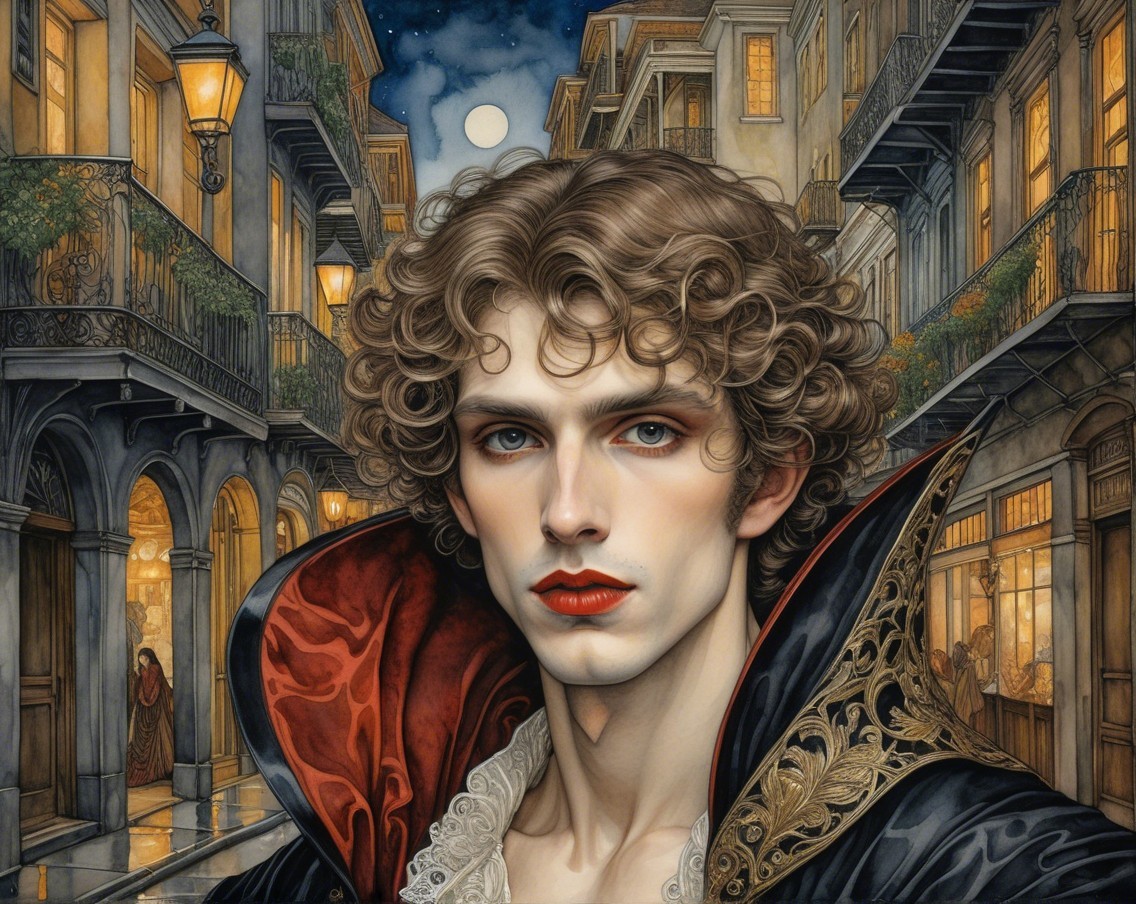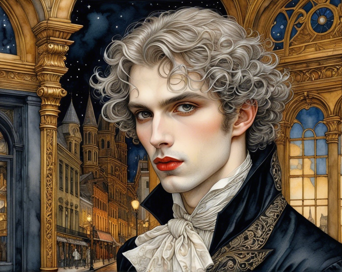 The image features a handsome young man with curly hair and striking features, dressed in elegant attire. He stands in a beautifully detailed, opulent interior, hinting at a historical setting.