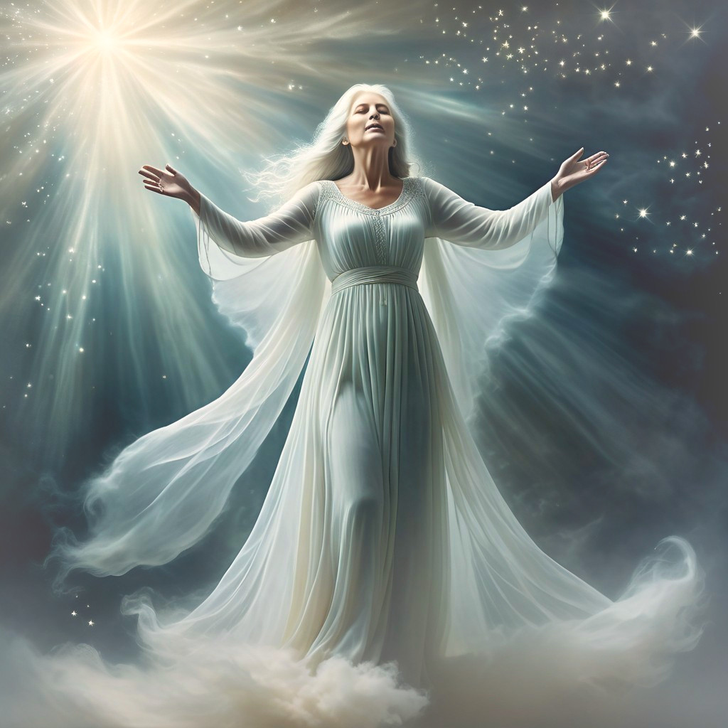 A celestial figure in a flowing white gown stands with outstretched arms, surrounded by ethereal light and stars, exuding serenity and grace in a dreamlike atmosphere.