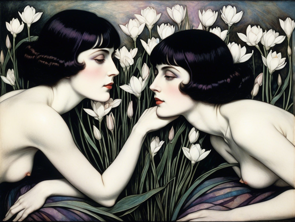 The image features two elegant women with dark hair, leaning towards each other amidst blooming white lilies. Their intricate features and soft expressions convey a sense of intimacy and beauty.