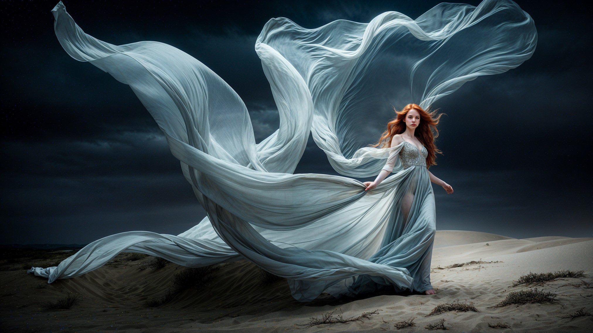 A graceful figure in a flowing, ethereal blue dress dances through a sandy landscape under a dark dramatic sky, her long hair and fabric swirling with the wind, creating a captivating scene.
