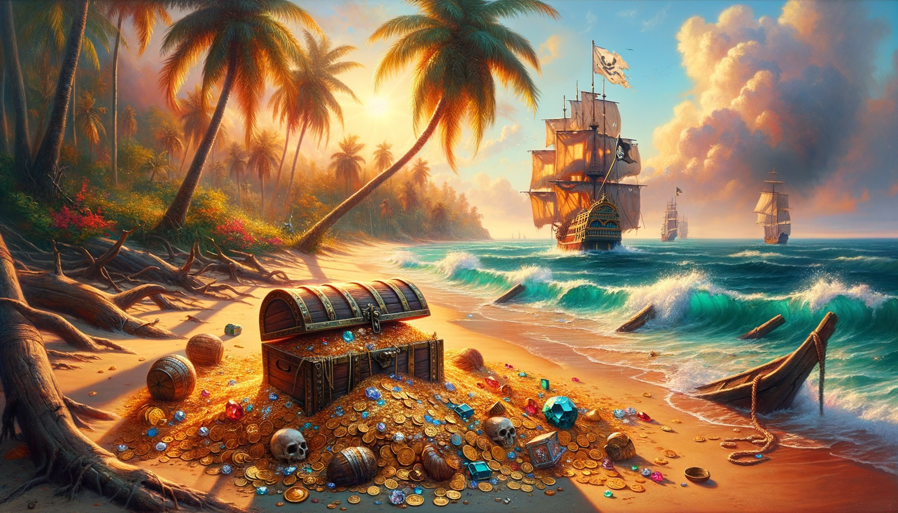 A vibrant beach scene with treasure, palm trees, and ships in the distance under a warm, cloudy sky.