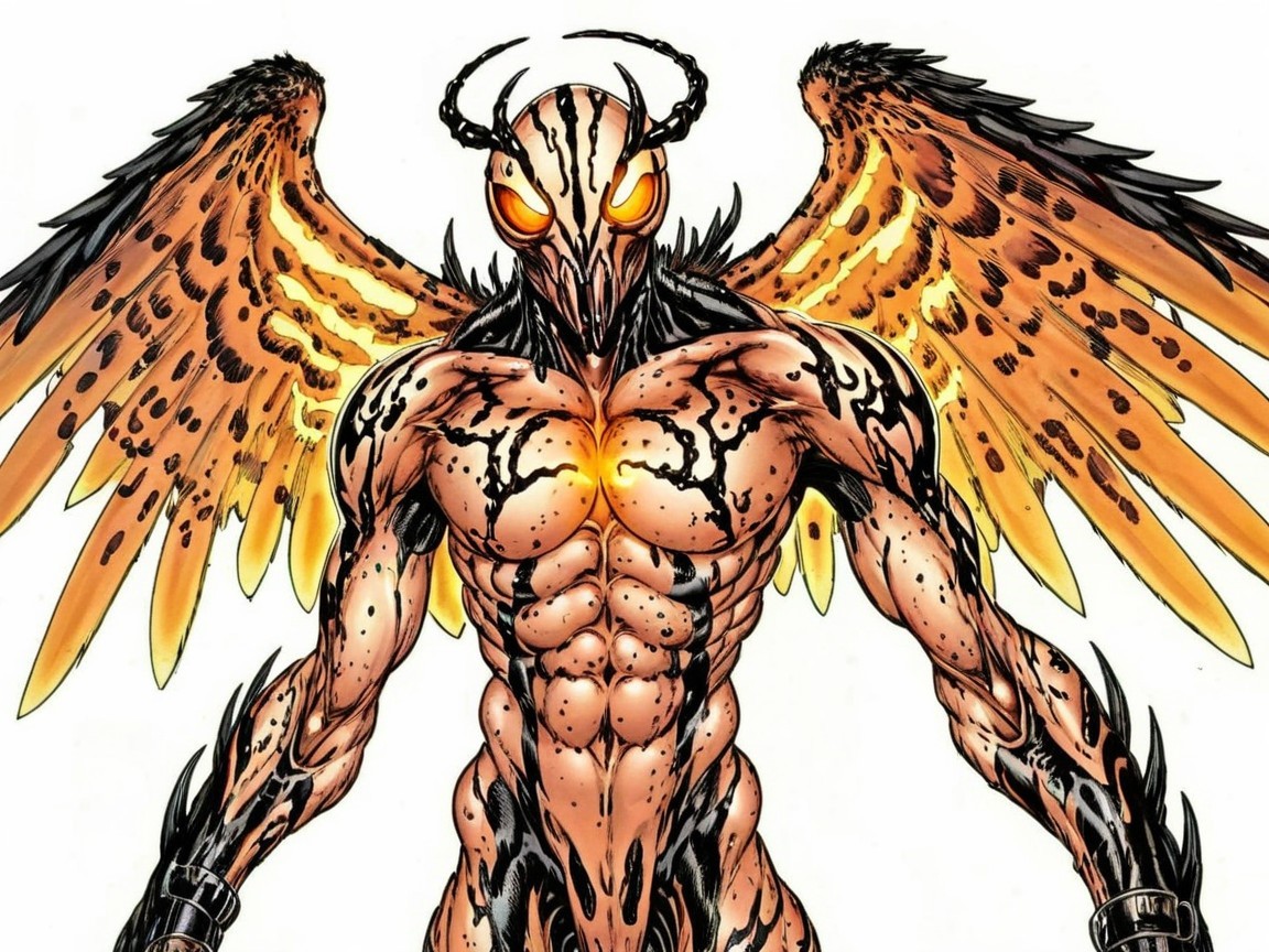 A powerful figure with orange and black striped skin, resembling a menacing creature, boasts large, luminous wings and glowing eyes, exuding a fierce, otherworldly energy