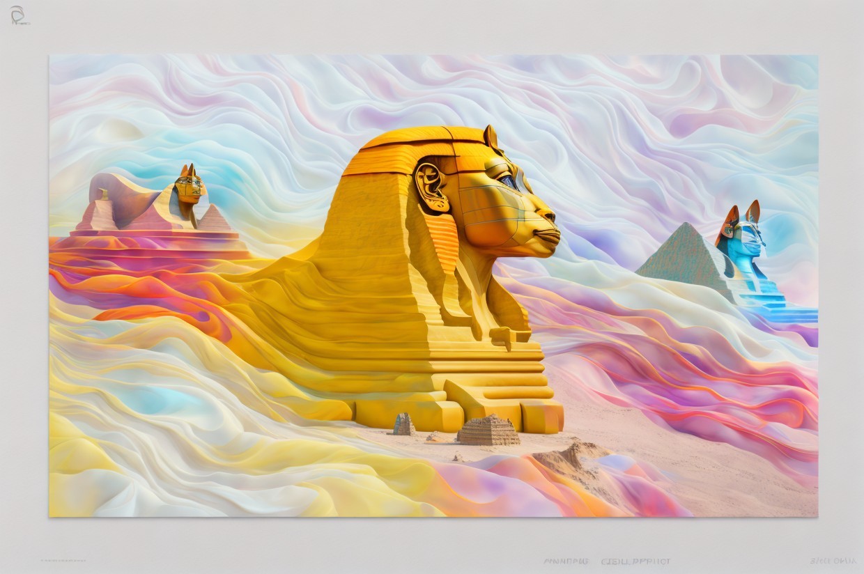 Surreal painting of stylized sphinx with vibrant patterns and pyramids