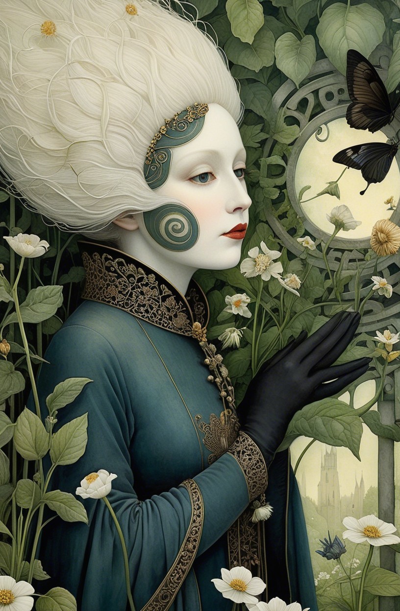 A serene figure with elongated ears and pale skin is surrounded by lush green foliage and elegant flowers. She wears a deep blue garment adorned with gold buttons, exuding an ethereal vibe.