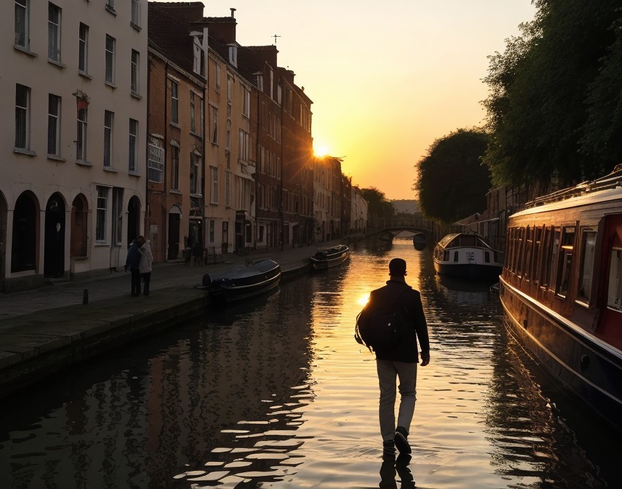 Serene Canal Scene at Sunset with Warm Reflections