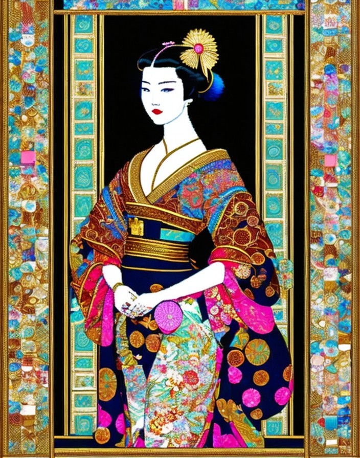 An artistic rendition of a woman in traditional Japanese attire with a decorative background.