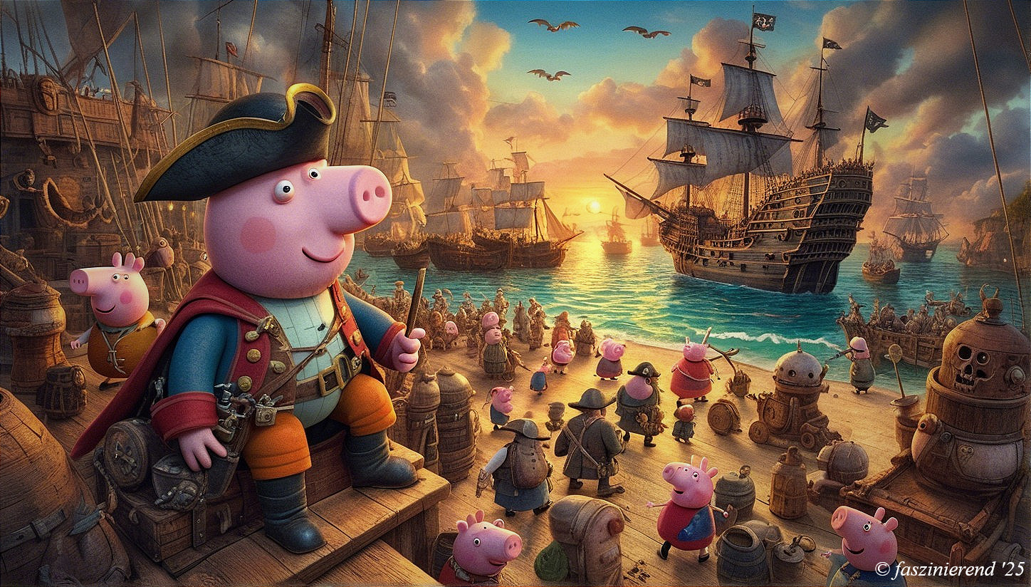 A colorful scene featuring a pig dressed as a pirate on a dock, surrounded by other pig characters. Ships sail in the background under a vibrant sunset sky, creating a whimsical adventure vibe.