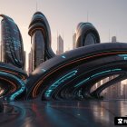 A futuristic cityscape featuring sleek, metallic structures with glowing blue and orange accents. The design is characterized by intricate curves and a high-tech aesthetic against a clear sky.