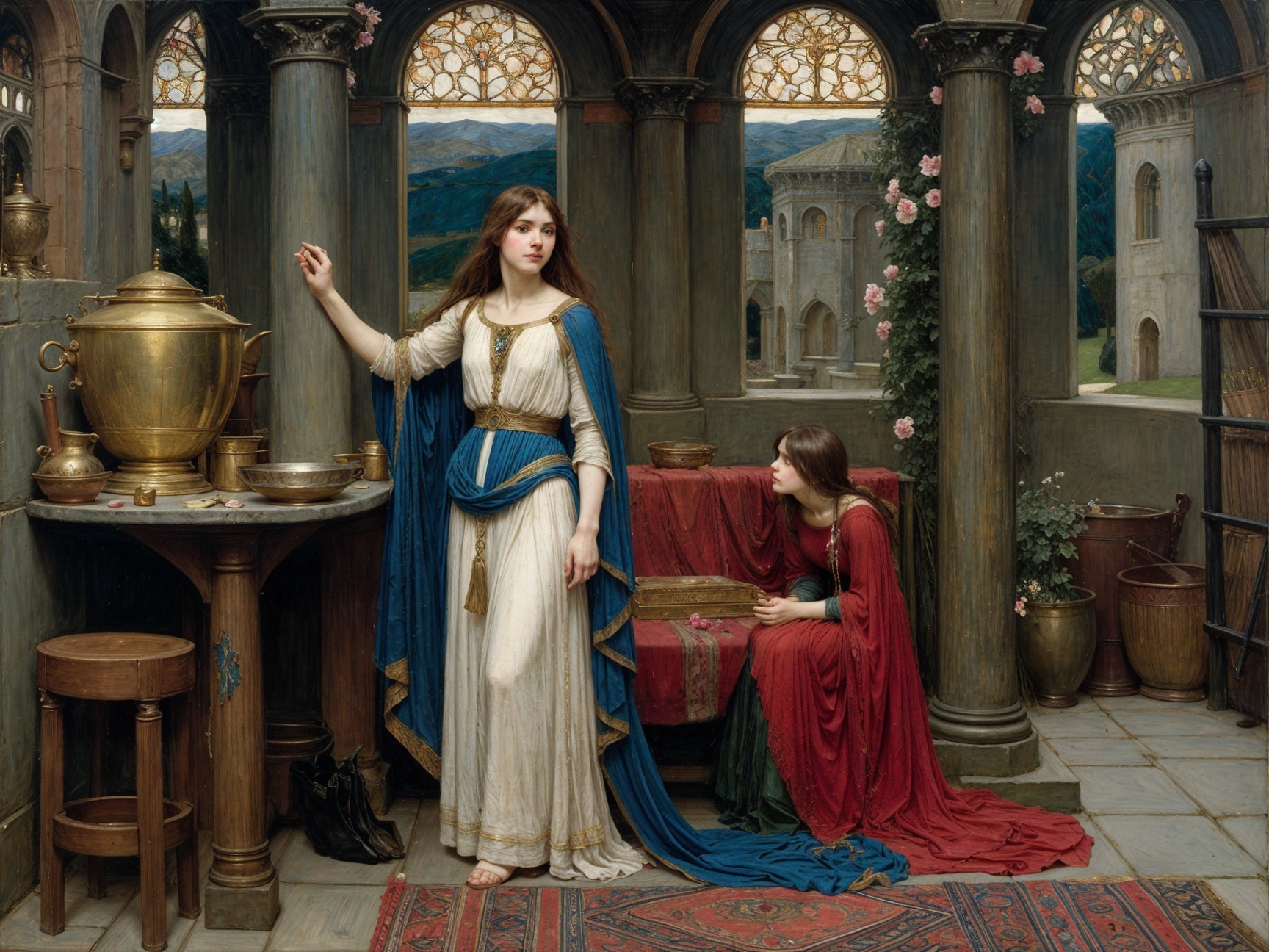 A woman in a flowing dress stands in an ornate room, with columns and stained glass. A Victorian view of what it was like in the 12th Century. She gazes thoughtfully, surrounded by bowls, draped fabrics, and a black dog at her feet.
