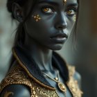 A striking portrait of a woman with dark skin and golden jewelry, adorned with intricate designs. Her captivating eyes and elegant attire create a mystical, enchanting atmosphere.