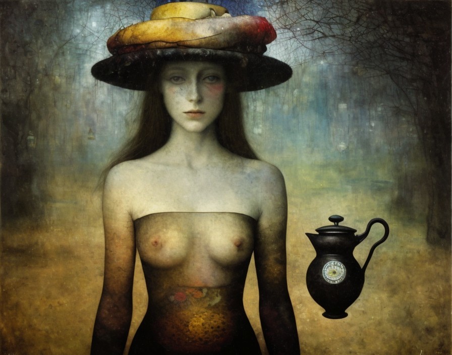 Surreal painting: woman with halo-like hat, ghostly face beside her, holding lantern-pot with tiny person. Mystic, dark tones, floral touches.