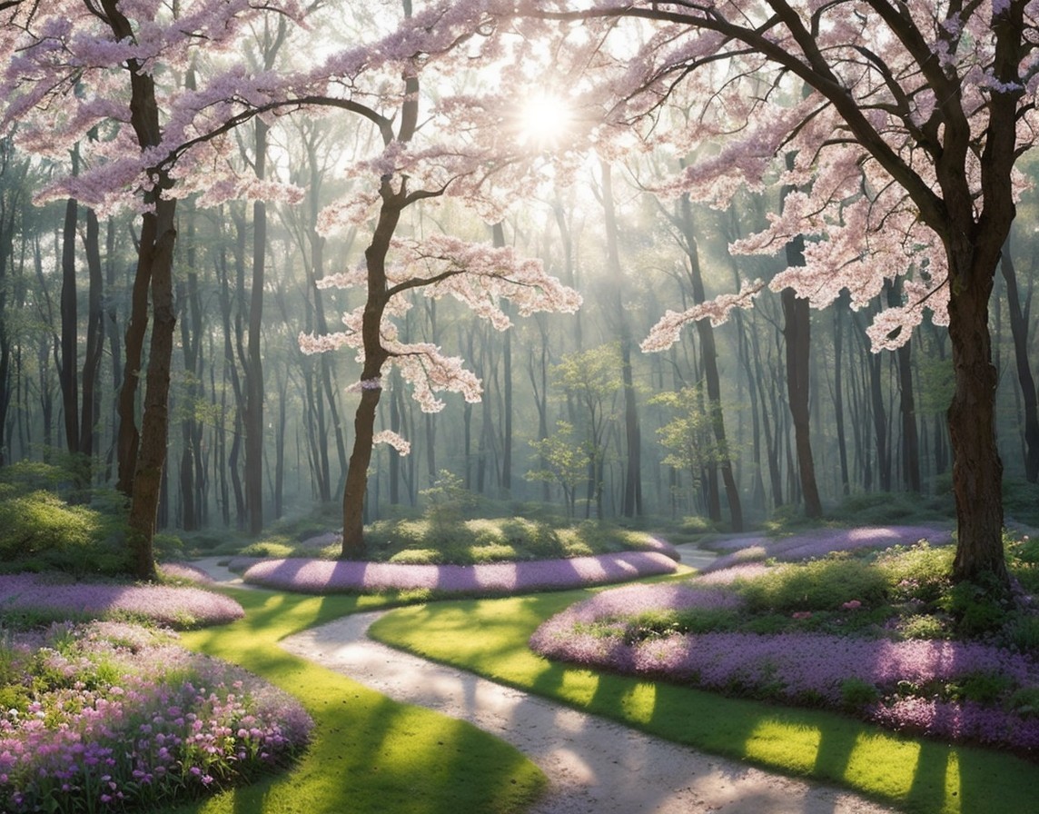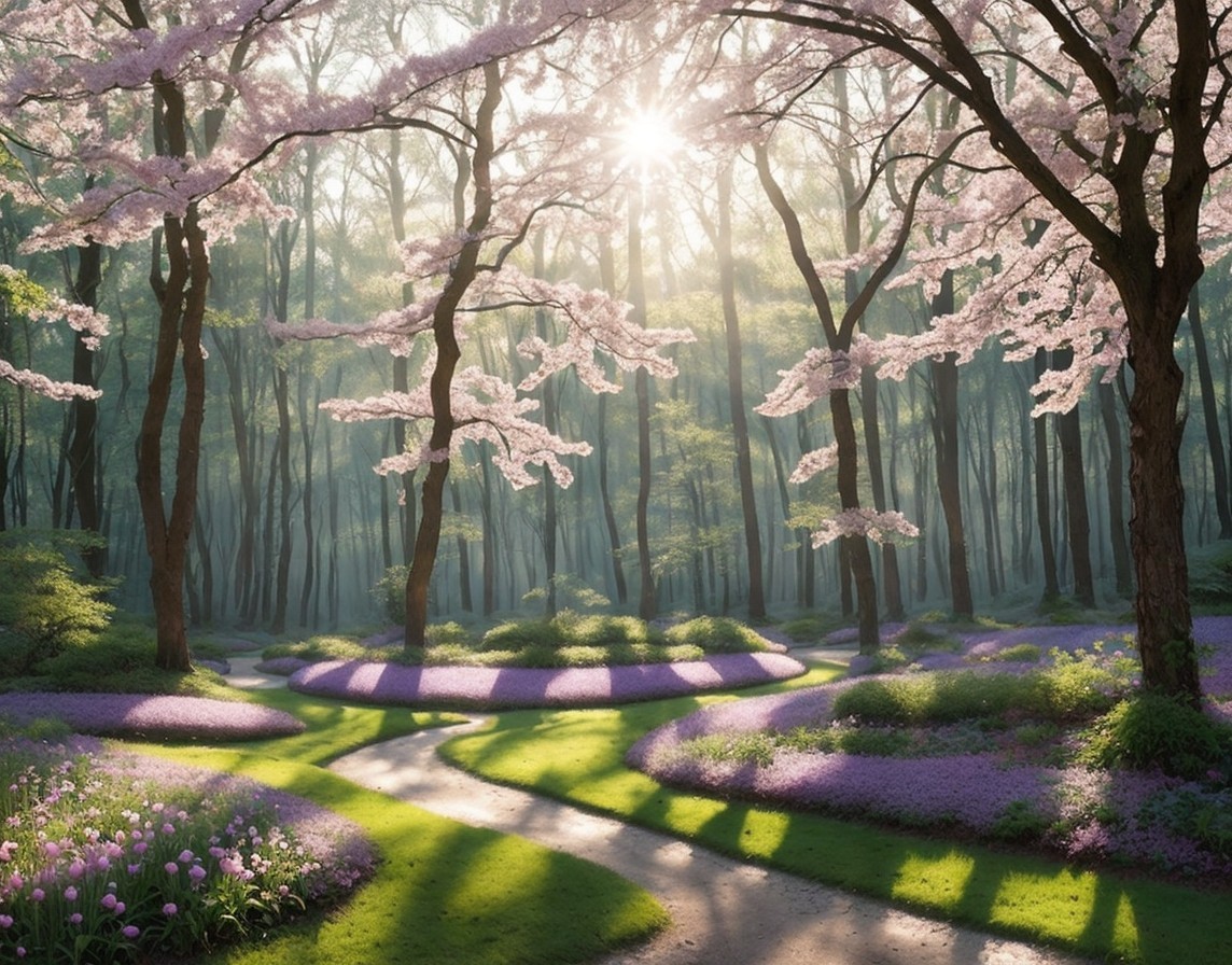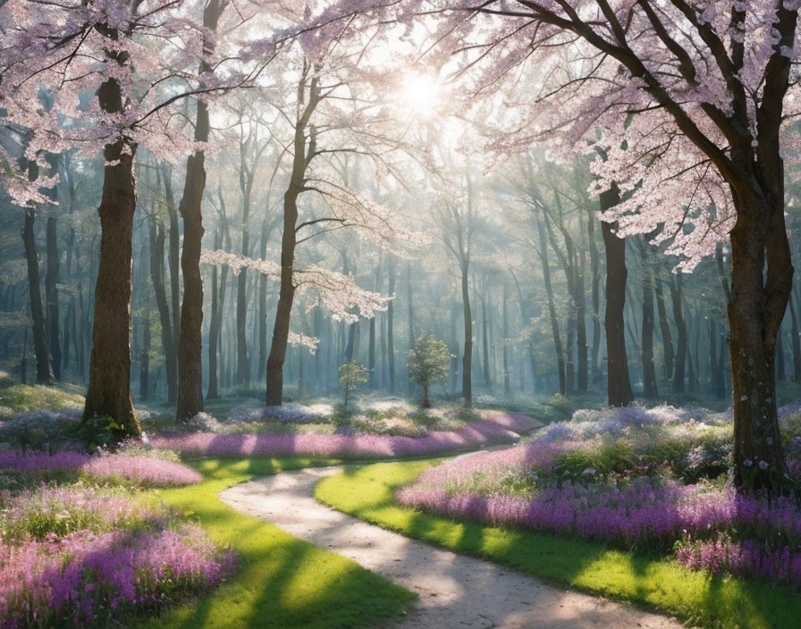 A serene path winds through a forest with blooming cherry blossoms and a carpet of purple flowers, bathed in soft sunlight.