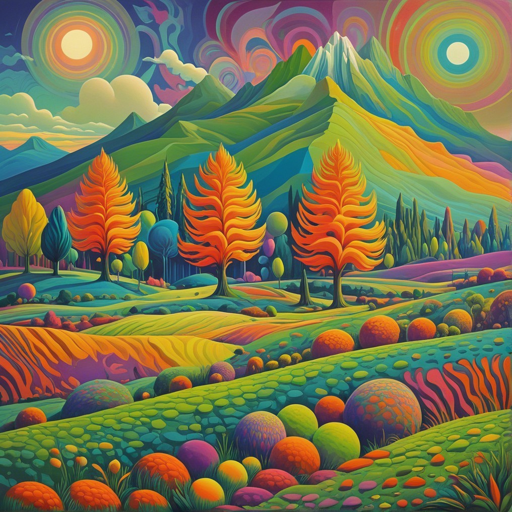 A vibrant, surreal landscape features colorful mountains, swirling skies, and trees in brilliant autumn hues. Lush fields and spherical shapes create a whimsical, dreamlike atmosphere.