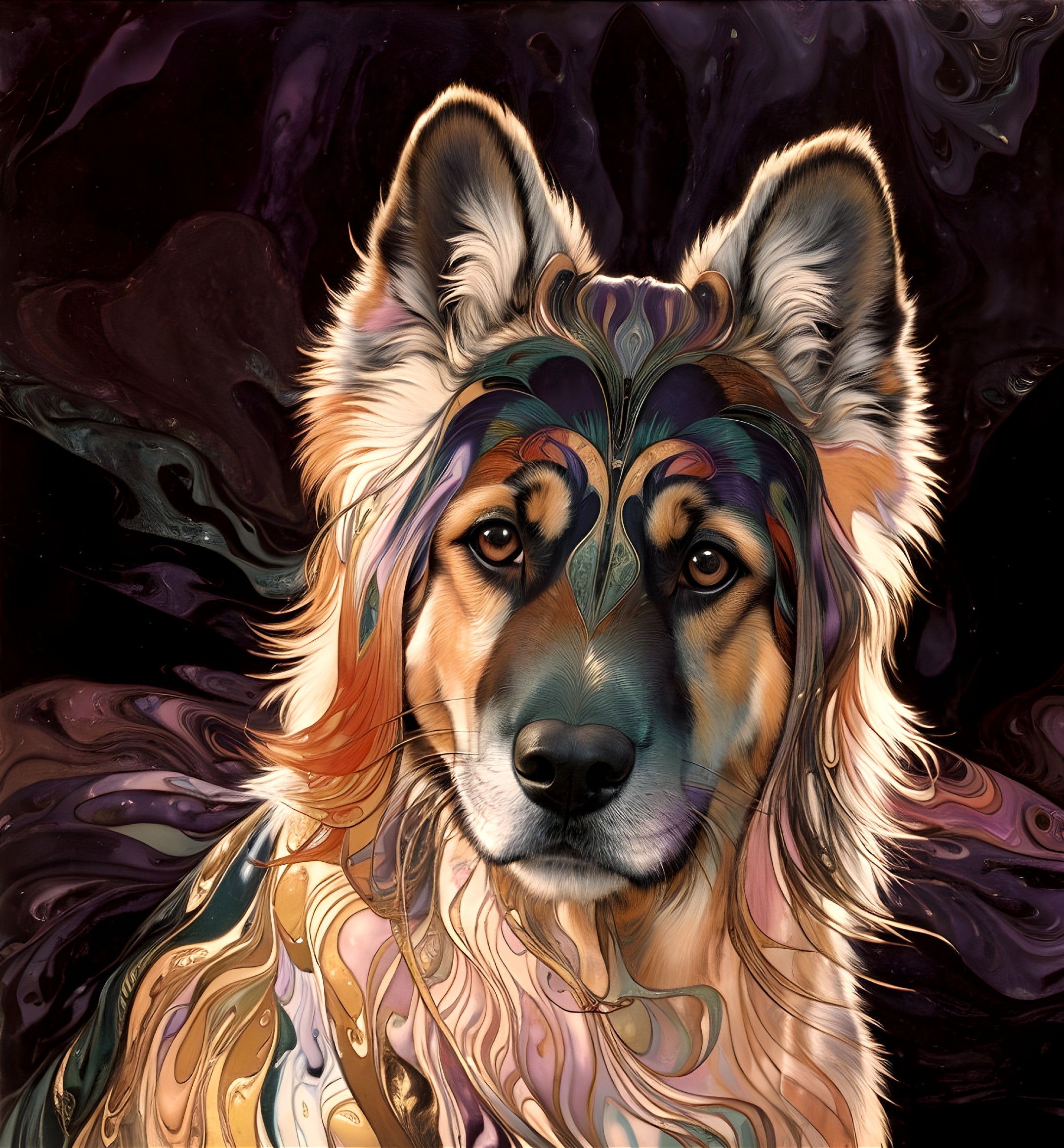 The image features a beautifully stylized dog with intricate, colorful patterns blending into its fur, set against a dark, swirling background that enhances its artistic flair.